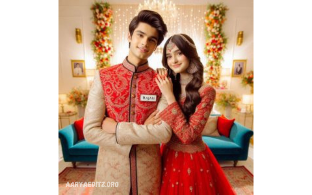 PROMPT:- a 16-year-old couple in a white and red Sherwani posing in a photo in a beautiful house and a boy named “RAJAN” written on a sherwani, with a girl, dramatic smile pose intricate, color splash, entire body photogenic shot, lighting decorations, with big tow sitt sofa in back. Realistic pictures, 4k ultra quality.wedding background,